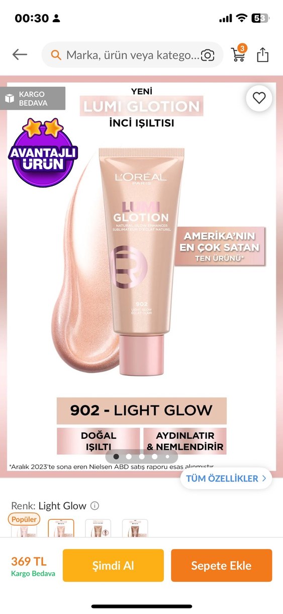 L'Oréal Lumi Glotion 902 Light Glow, doğal inci ışıltısı sağlar, cildi aydınlatır ve nemlendirir. Açık bej tonunda hafif bir kapatıcıdır. Sıfır ürün