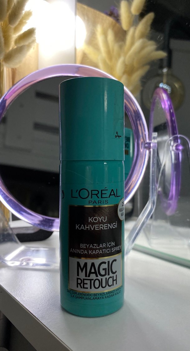 L'Oréal Magic Retouch sprey, koyu kahverengi tonunda beyaz saçları anında kapatır. Bir sonraki şampuana kadar hızlı kapama sağlar.