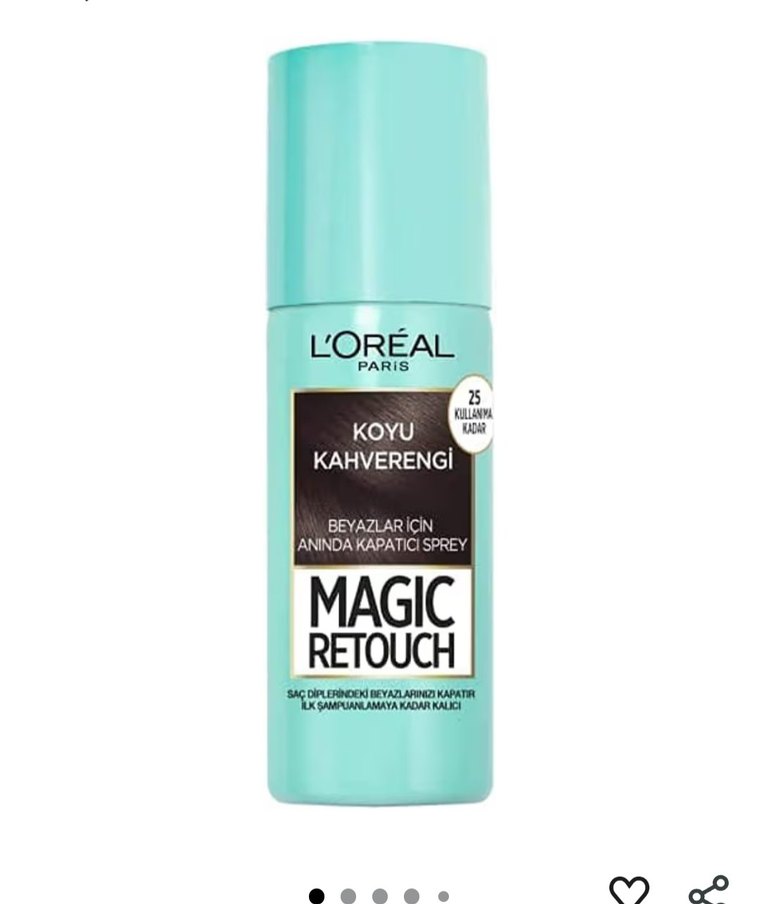 L'Oréal Magic Retouch sprey, beyaz saçları anında koyu kahverengi tonuyla kapatır ve gün boyu kalıcıdır. 25 kullanıma uygundur. sıfır ürün saç rengimi degistirdigim için kullanmadım hiç