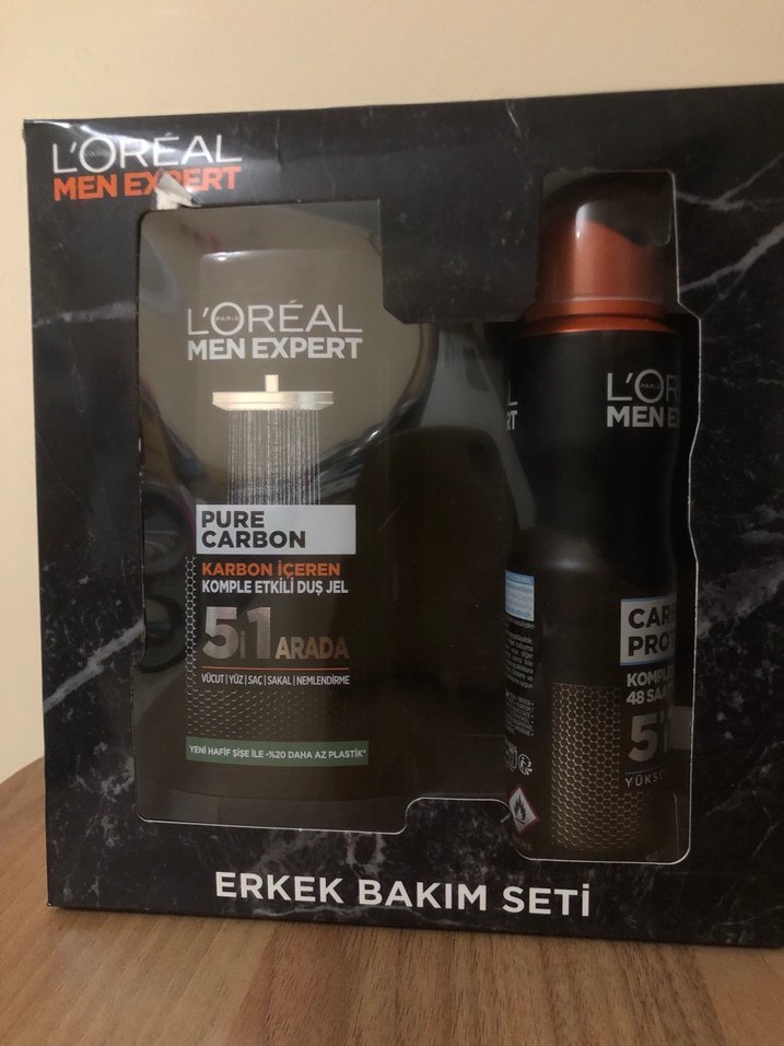 L'Oréal Men Expert Pure Carbon karbon içeren duş jeli ve 48 saat koruma sağlayan deodorant sprey içeren erkek bakım seti.