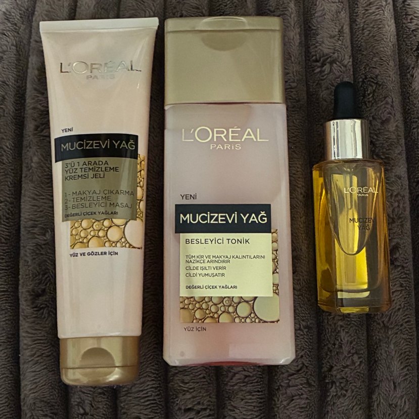 L'Oréal Paris Mucizevi Yağ 3'ü 1 Arada temizleme jeli makyajı çıkarır, temizler ve besler. Besleyici tonik ise cildi yumuşatır, ışıl ışıl yapar.
