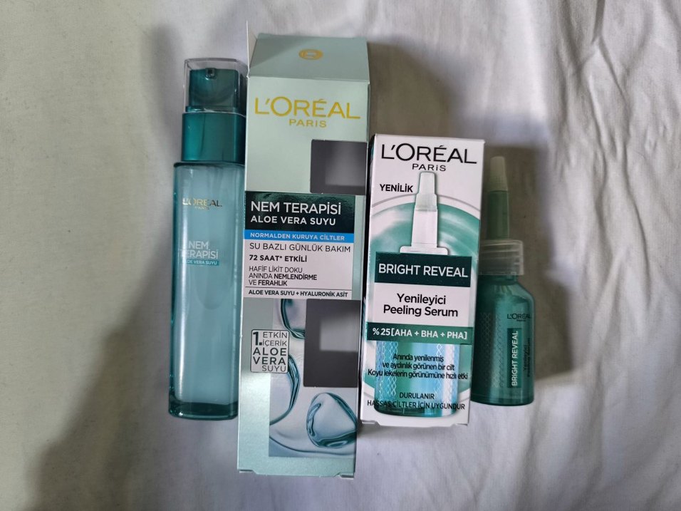 L'Oréal Aloe Vera suyu ve hyaluronik asit içeren su bazlı günlük nemlendirici jel 72 saat nem sağlar. Bright Reveal peeling serumu %25 AHA, BHA, PHA ile cildi yeniler ve peeling yapar.