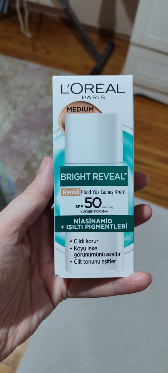 L'Oréal Paris Bright Reveal renkli yüz güneş kremi SPF 50 ile yüksek koruma sağlar. Niacinamide ve ışıltılı pigmentler içerir, cildi korur, koyu lekeleri azaltır ve cilt tonunu eşitler. medium renk. sadece rengine bakıldı
