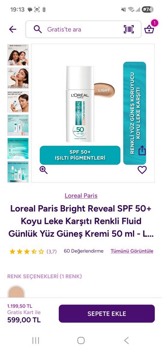 L'Oréal Paris Bright Reveal renkli SPF 50 yüz güneş kremi, niasinamid ve ışıtıcı pigmentler içerir. Cildi korur, koyu leke görünümünü azaltır ve cilt tonunu eşitler. Ürünün rengi uymadı içerisinden cok az bir damla kadar rengine bakmak icin kullandım ürün geldiği an yükledim gratisten alındı Ürünün güncel fiyatı görseldeki gibi rengi medium