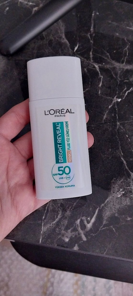 L'Oréal Paris Bright Reveal, SPF 50 yüksek koruma sağlar. Yüz için renkli sıvı formda, UVB ve UVA ışınlarına karşı korur.Medium renktir.Sadece bir kez kullandım