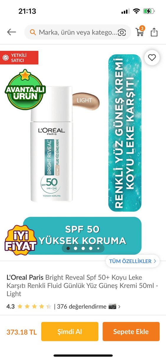L'Oreal Paris Bright Reveal SPF 50+ koyu leke karşıtı renkli fluid günlük yüz güneş kremi, yüksek koruma sağlar. Hafif renk tonuyla güneşten korur. ☀️ Merhaba bana koyu geldiği için satmak istiyorum hiç kullanılmadı 0 ürün medium rengi