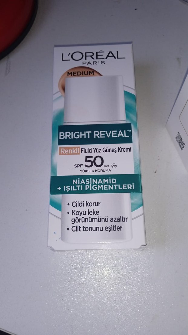 L'Oréal Paris Bright Reveal renkli yüz güneş kremi, SPF 50 yüksek koruma sağlar. Niasinamid ve ışıltılı pigmentler içerir, cildi korur, koyu leke görünümünü azaltır ve cilt tonunu eşitler. Orta ton. RENGİ BANA KOYU GELDİ COK BEYAZ TENLİ OLDUGUM İÇİN Bİ DAMLA RENGİNE BAKMAK İÇİ KULLANDIM