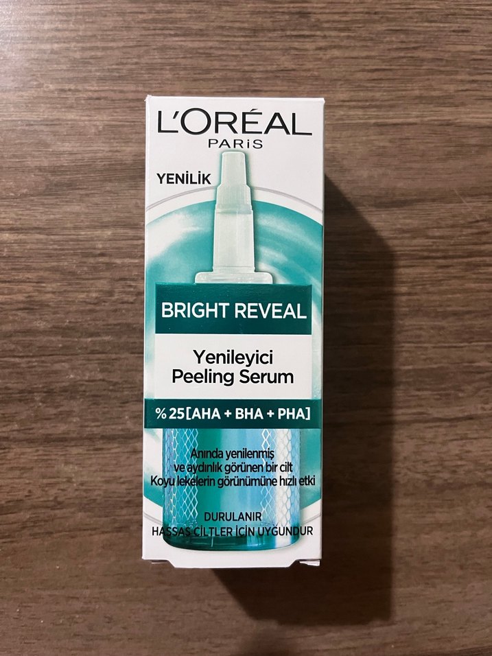 L'Oréal Paris Bright Reveal Peeling Serum, %25 AHA, BHA ve PHA içerir. Anında yenilenmiş, aydınlık bir cilt sağlar, koyu lekelerin görünümünü hızla azaltır. Hassas ciltler için uygundur, durulanır. ✨