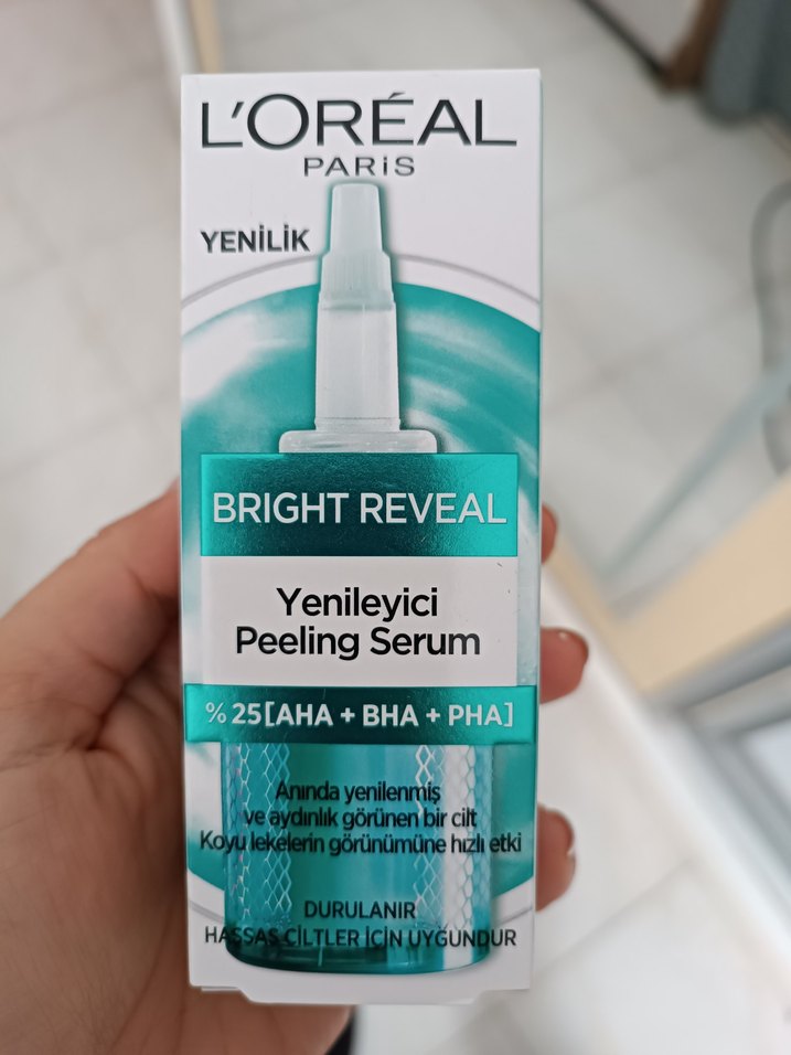 L'Oréal Paris Bright Reveal Peeling Serum, %25 AHA, BHA ve PHA içeriğiyle anında yenilenmiş ve aydınlık bir cilt sağlar. Koyu lekelerin görünümünü azaltır ve hassas ciltler için uygundur. Durulanır. ✨
