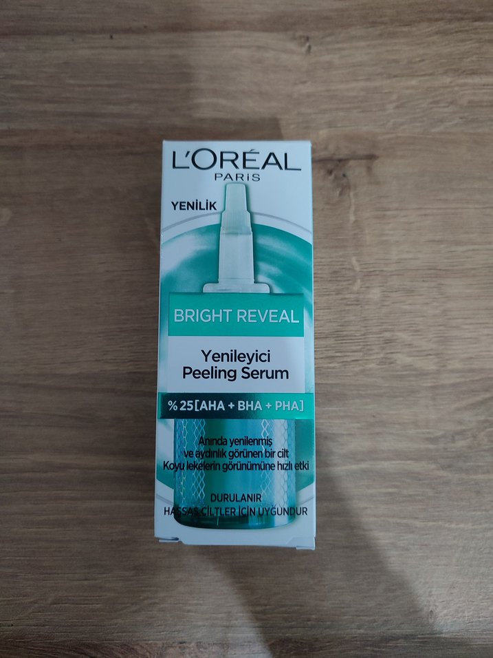 L'Oréal Paris Bright Reveal Peeling Serum, %25 AHA, BHA ve PHA ile cildi anında yeniler. Durulanabilir ve hassas ciltler için uygundur, koyu lekelerin görünümünü azaltır. Açılmadı, hiç kullanılmadı, yeni ürün.