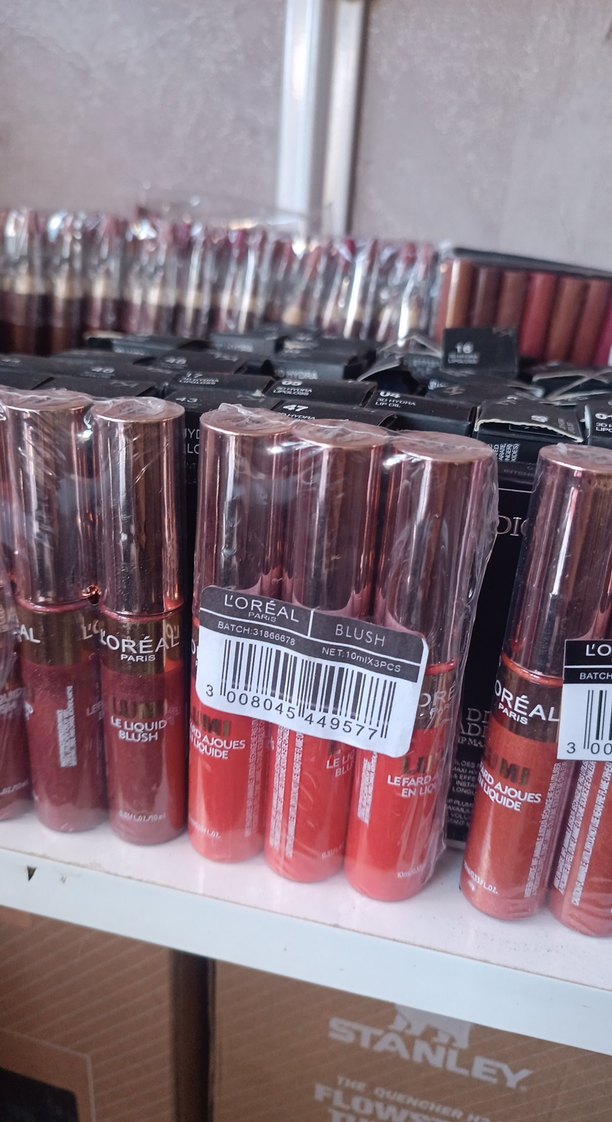 L'Oréal Paris markalı, canlı kırmızı renkte, yumuşak sıvı dokulu ruj. Ambalajda 'RE, BLUS' yazısı ve barkod bulunur.