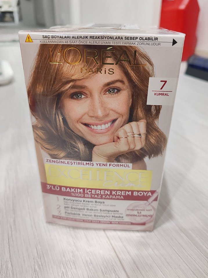 L'Oréal Paris Excellence 7 Kumral saç boyası, zenginleştirilmiş yeni formül ve 3'lü bakım kremi ile %100 beyaz kapama sağlar. 3 adet ambalajı açılmamış orijinal boya.