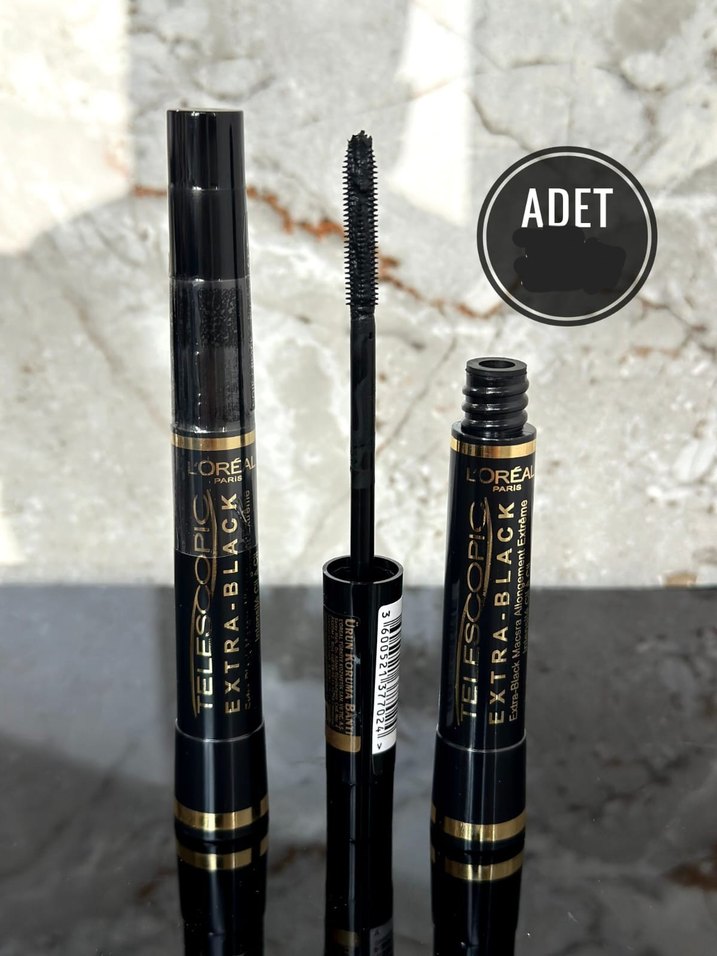 L'Oréal Paris Extra Black maskara, koyu siyah renkte ve yoğun kirpikler için uygundur. Üzerinde 'ADET' yazısı bulunur.