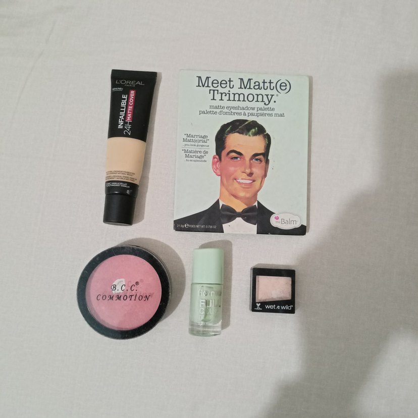 L'Oréal fondöten (kullanıldı), The Balm Meet Matt(e) Trimony göz farı paleti (aynası ve en alttaki rengi düşmeye bağlı kırıldı diğer renkleri dolu ve sağlam) , B.C.C. Commotion Pembe allık, Wet n Wild açık ton tekli göz farı, Flormar yeşil oje (kullanılmadı).