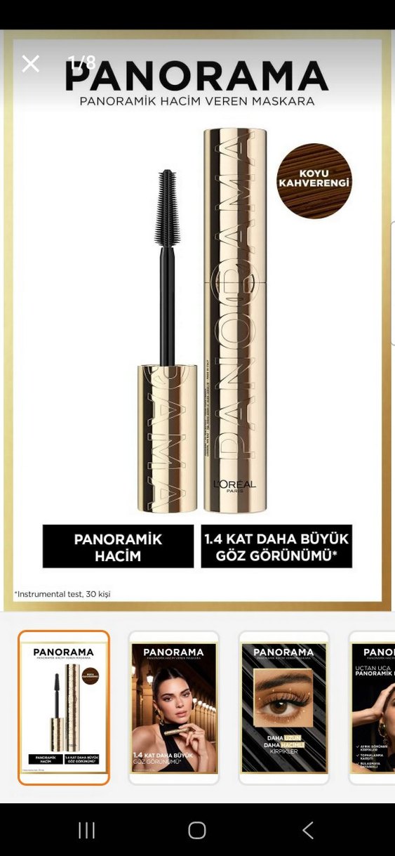 L'Oréal Paris Panoramik Hacim maskara, koyu kahverengi panoramik hacim ve 1.4 kat daha büyük göz görünümü sağlar.