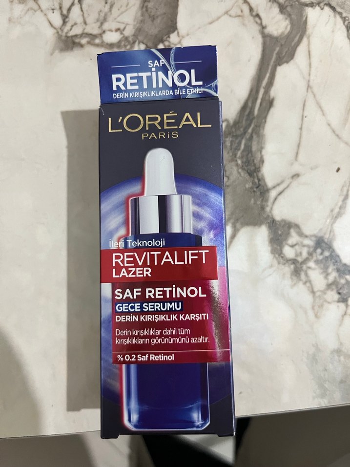L'Oréal Paris Revitalift Lazer gece serumu %0.2 saf retinol içerir, derin kırışıklıklar ve tüm ince çizgilerin görünümünü azaltır. Ürünü aldım ve hiç kullanmadım