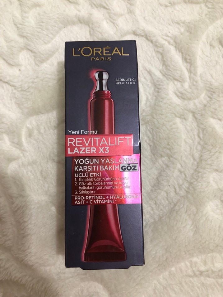 L'Oréal Paris Revitalift Lazer X3 göz kremi, serinletici metal başlık ve pro-retinol, hyaluronik asit, C vitamini içerir. Yoğun yaşlanma karşıtı bakımdır. Hamile olduğum için stok yaptığım ürünleri satıyorum