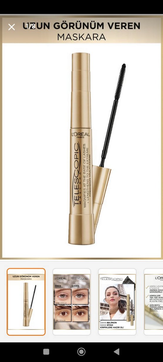 L'Oréal Paris Telescopic maskara, parlak bej renginde, kirpikleri uzatan ve hassas uygulama sağlayan bir üründür.