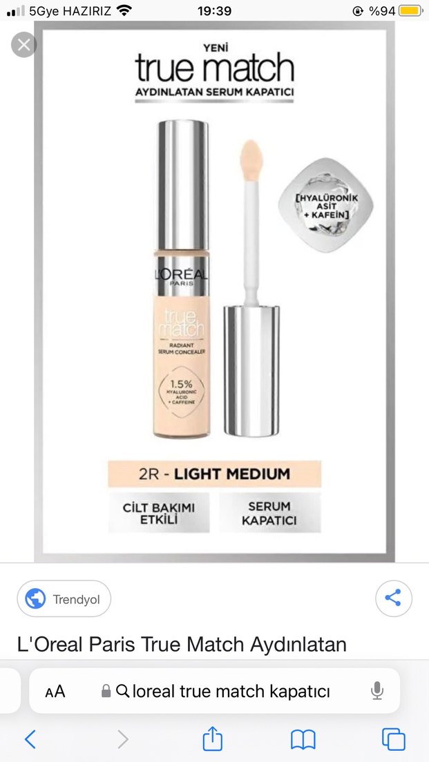 Hiyalüronik asit ve kafein içeren serum formülüyle cildi aydınlatan ve kapatan L'Oreal Paris True Match 2R Light Medium kapatıcı. Cilt bakımına destek sağlar. ✨GRATİSTEN alındı