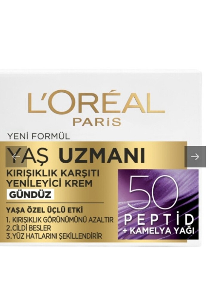 Cildin her yaşta özellikle nemlendirilmeye ihtiyacı vardır. 50'lu yaşlarda, cildin nemini kaybetmesiyle kırışıklıklar belirginleşir ve cilt kurur.L'OrÉal Paris YAŞ UZMANI KIRIŞIKLIK KARŞITI YENİLEYİCİ KREM, 50'li yaşların ihtiyaçlarını karşılamak için tasarlandı._x000D_YAĞ öZLERİ içeren formülü cildi yoğun bir şekilde besler ve kuruluğa karşı korur.Yenileyici özellikleri ile bilinen OPUNTİA çİçEĞİ özü ile zenginleştirilmiştir._x000D_üç ETKİLİ UZMAN FORMüL:_x000D_1. KIRIŞIKLIK GöRüNüMüNü AZALTIR._x000D_Cilt daha pürüzsüz ve yenilenmiş bir görünüm kazanır._x000D_2. YüZ HATLARINI ŞEKİLLENDİRİR._x000D_Cilt esnekliği gözle görülür şekilde artar ve yüz hatları daha belirgin hale gelir._x000D_3. NEMLENDİRİR._x000D_Cilt beslenir ve sağlıklı bir ışıltı kazanır._x000D_Her gün iyice temizlenmiş yüz ve boyun bölgesine dairesel hareketlerle uygulayın._x000D_
