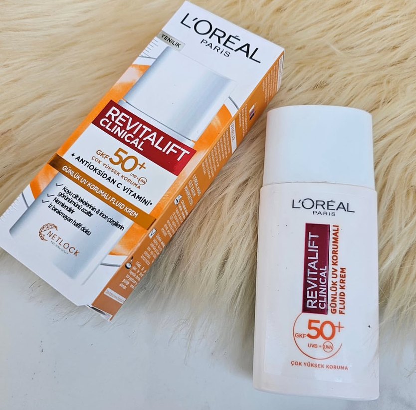 L'Oréal Revitalift Clinical, SPF 50+ ve antioksidanlarla çok yüksek koruma sağlar. Günlük kullanım için UVB koruyucu akışkan kremdir. ☀️