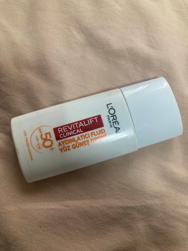 L'Oréal Revitalift Clinical yüz güneş kremi, SPF 50 koruma sağlar ve cildi aydınlatır. Günlük kullanıma uygundur. ☀️ yarısın fazlası dolu 2-3 kere kullandım sevemedim içerisinde ne kadar kaldı gösteremiyorum şişesinden gözükmüyor.