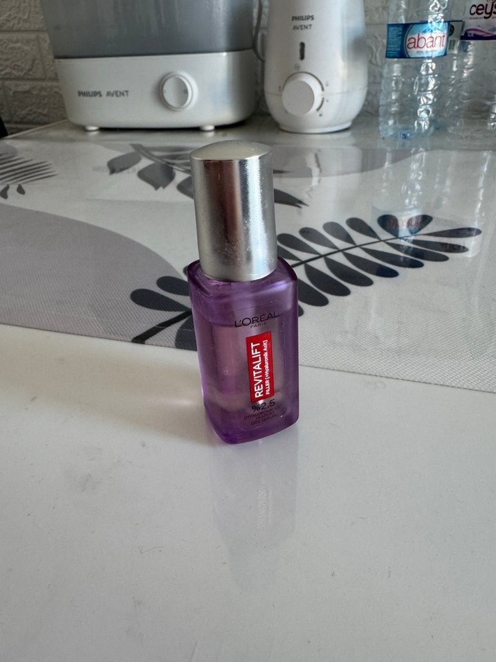 L'Oréal Revitalift mor şişede ve gümüş kapaklı, göz çevresi besleyip güçlendirmek için tasarlanmıştır.