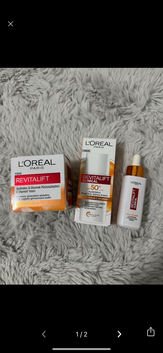 Loreal paris markasının meşhur serisi. C vitaminli pürüzsüzleştirici krem ile güneş kremi açılmamış sıfır ürünlerdir. C vitamini serum kullanılmıştır içinde ne kadar kaldığını anlayamadım ama birkaç kullanımlık var diye düşünüyorum. Diğer ürünler zaten kullanılmamış paketli ürünler aynı seriye ait c vitamini serumu da denemiş olmak isterseniz işinizi görecektir. KREM SATILMIŞTIR, SERUM VE GÜNEŞ KREMİ DURUYOR