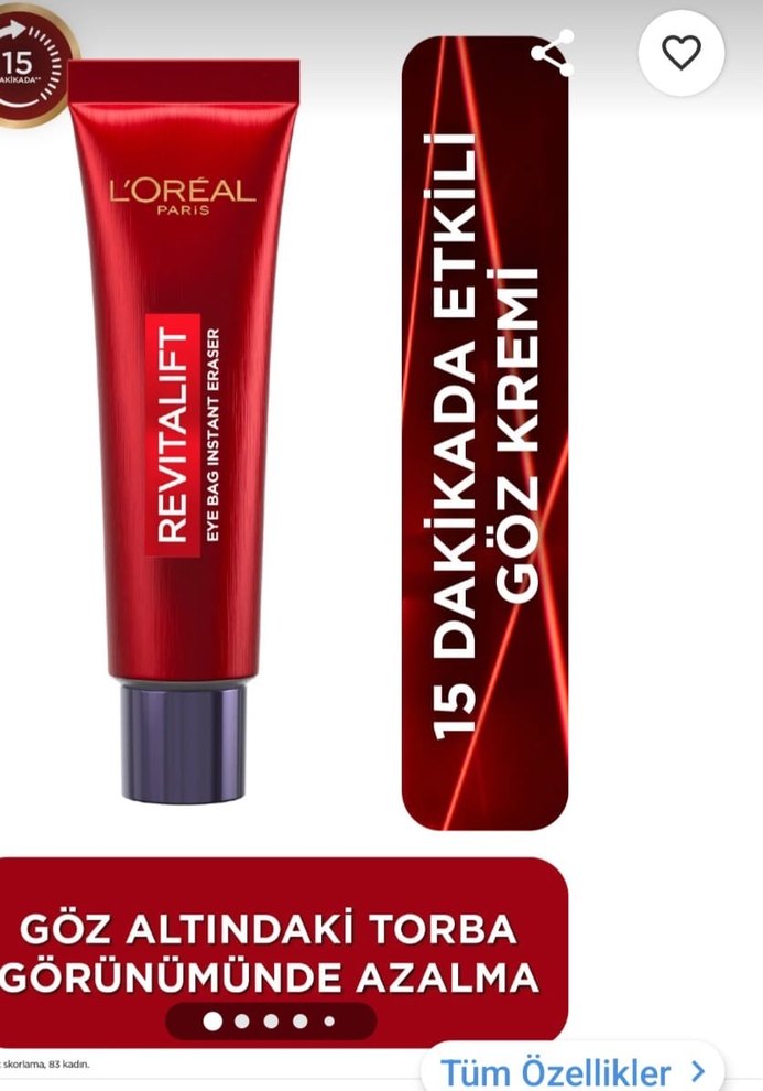 L'Oréal Revitalift göz kremi koyu kırmızı ambalajda, göz altı torbalarının görünümünü azaltır ve 15 dakikada etkisini gösterir.