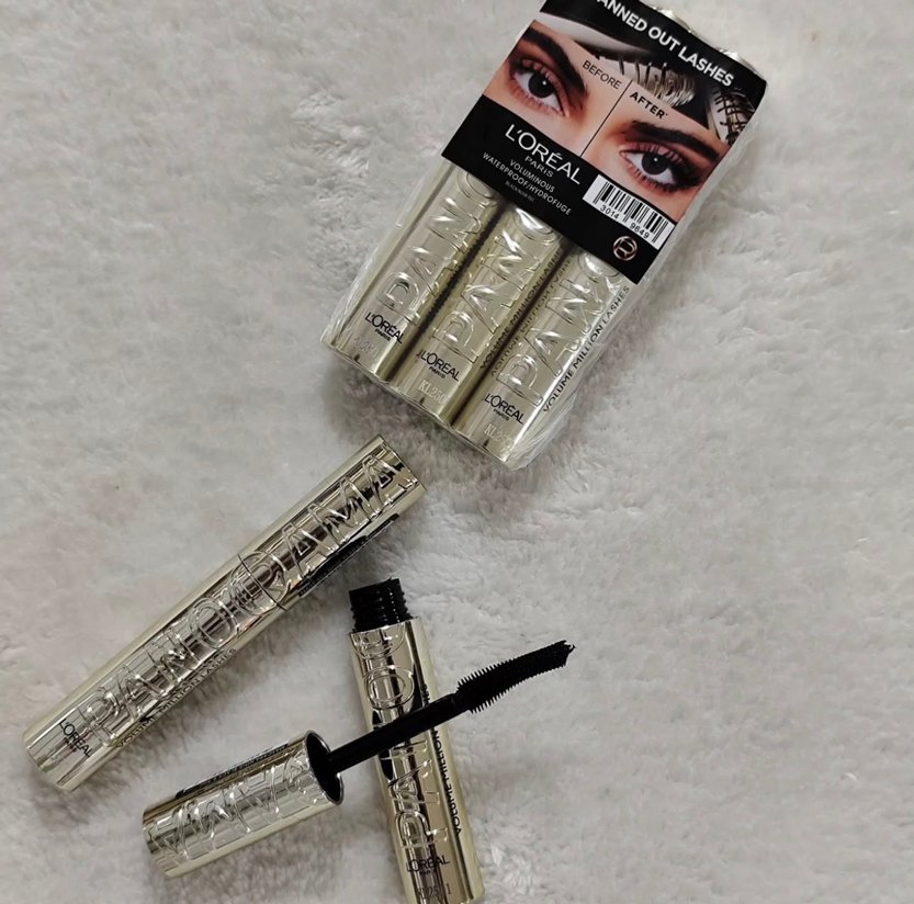 L'Oréal parlak bej ambalajlı maskara seti, kirpikleri belirginleştiren kavisli fırça ile hassas uygulama sağlar.