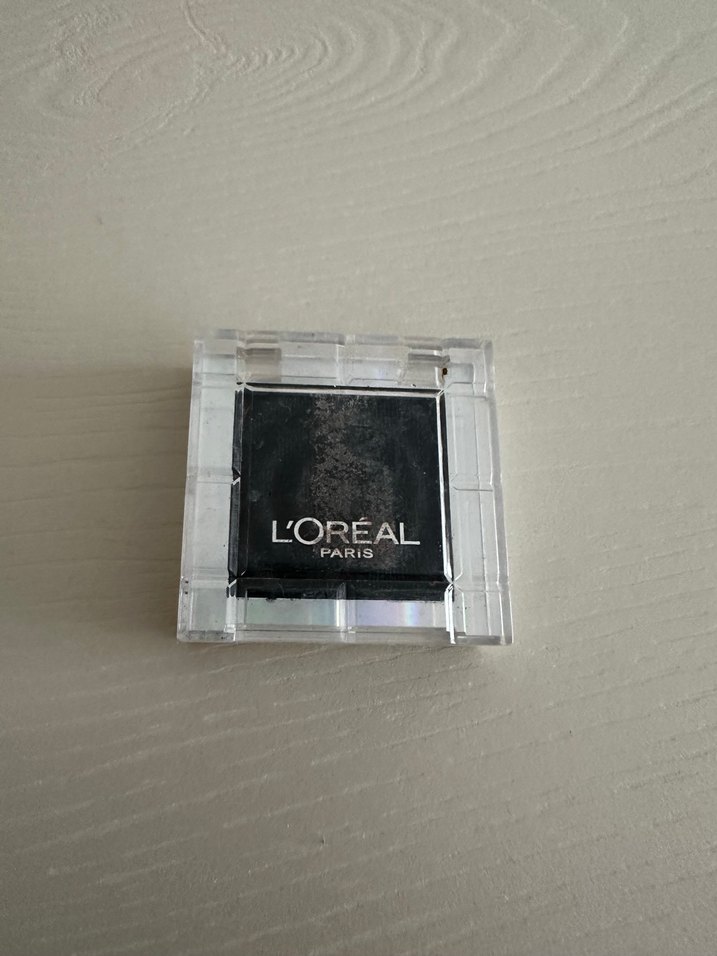 L'Oréal markalı siyah göz farı, yoğun koyu renk sunan kompakt kutuda. Hiç kullanılmadı