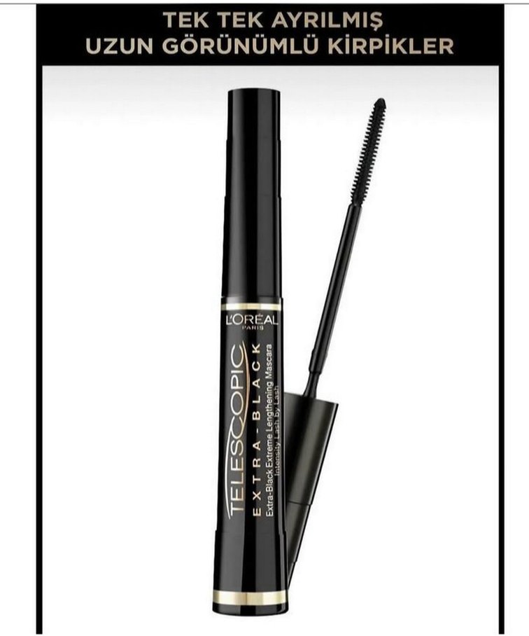 L'Oreal Teleskopik siyah maskara, tek tek ayrılmış ve uzun görünümlü kirpikler sağlar.