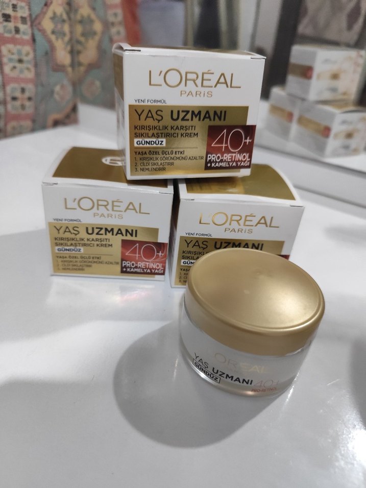 L'Oréal Paris Yaş Uzmanı 40+ gündüz kremi, Pro-Retinol ve kamelya yağı içerir. Kırışıklık karşıtı, nemlendirici ve cilt koruyucu etkisi vardır.