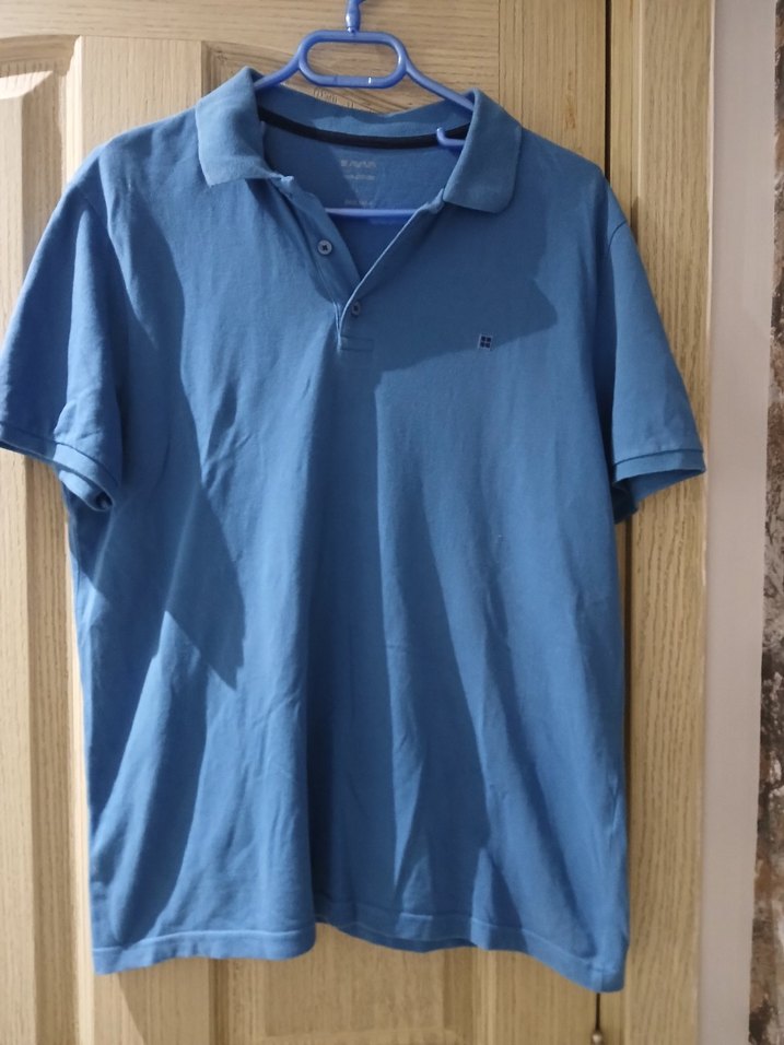 L ve XL bedene uyumlu. Erkekler için mavi kısa kollu polo tişört, sıfır ayarında.