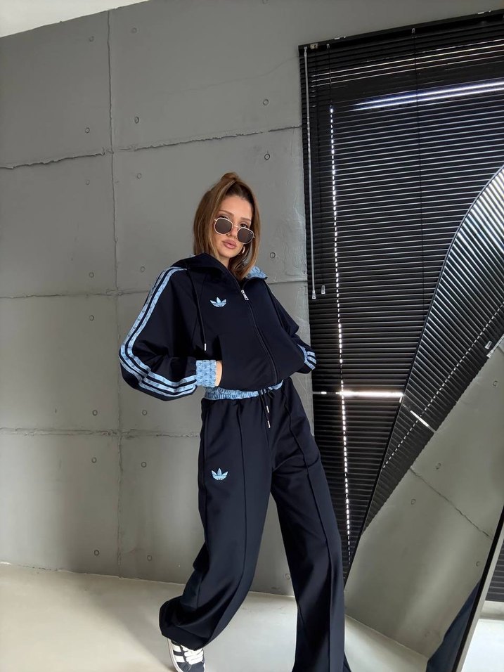 Siyah denimden, bol kesim, uzun kollu ve yüksek yakalı kadın spor takımı. Rahat ve şık dış mekan kullanımı için uygundur.