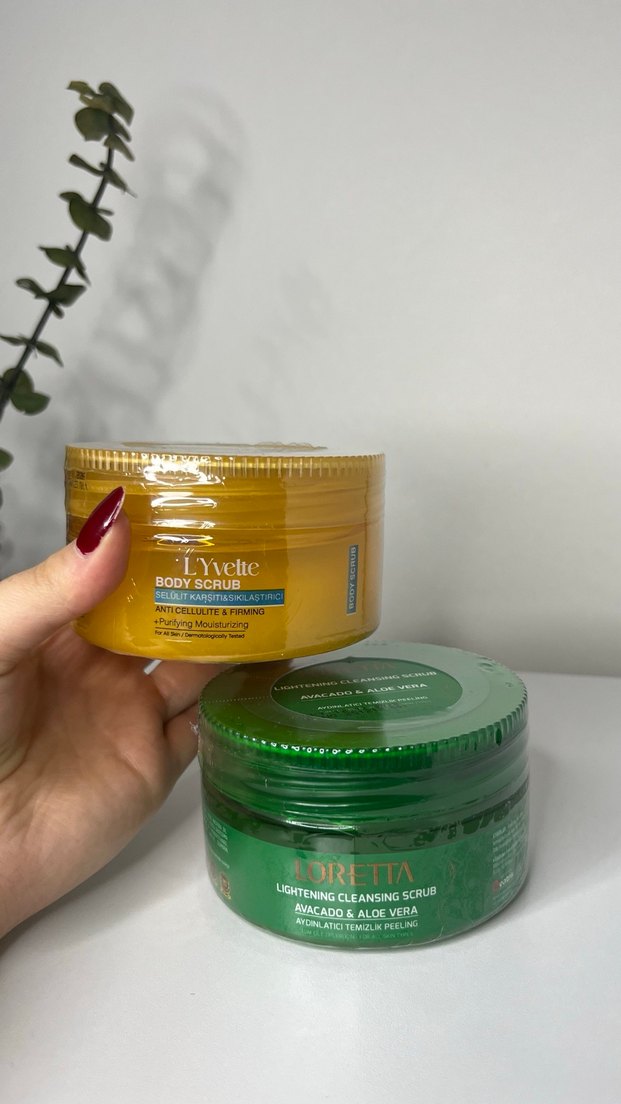 L'Yelte Vücut Peelingi, anti-selülit ve sıkılaştırıcı etkiye sahip, nemlendirir. Loretta Temizleyici Peeling avokado ve aloe vera içerir, nazik temizlik sağlar. İkisi 400₺ tekli 200₺