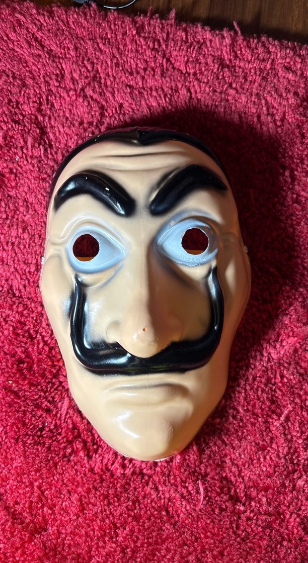 belirgin siyah kaşlar ve bıyık detaylı, göz delikleri bulunan maske.
