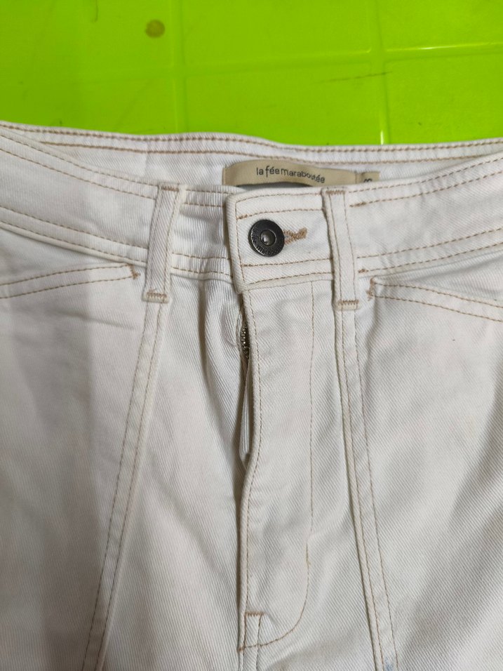 Fransız pantolon markasının gayet kaliteli bir ürünüdür. Sitesinde 100-125 Euro fiyatı var . Nokta hatalar fotoğrafta belirtilmiştir . Beyaz renkli, bol kesim ve midi boy kadın pantolon, yumuşak sentetik kumaştan üretilmiştir. Desensiz tasarımıyla rahat ve şık dış mekan kullanımı için uygundur.
