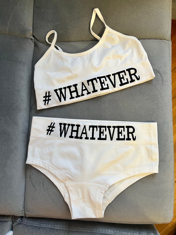 Beyaz renkte, "#WHATEVER" baskılı kısa atlet ve mini külot takımıdır. Rahat ve günlük kullanıma uygundur.XS bedenede olur.Hiç kullanılmadı yeni ve sorunsuzdur.