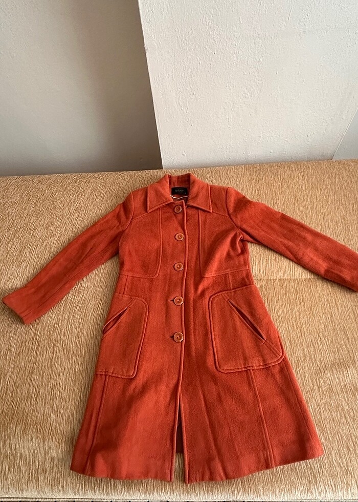 La Luce somon renkli kaban 38 beden ama 40 bedene de oluyor. Yaka dikiş yerinden boy 85 cm, omuz 42 cm, iki koltuk arası 50 cm, bel 47 cm, kol boyu 60 cm