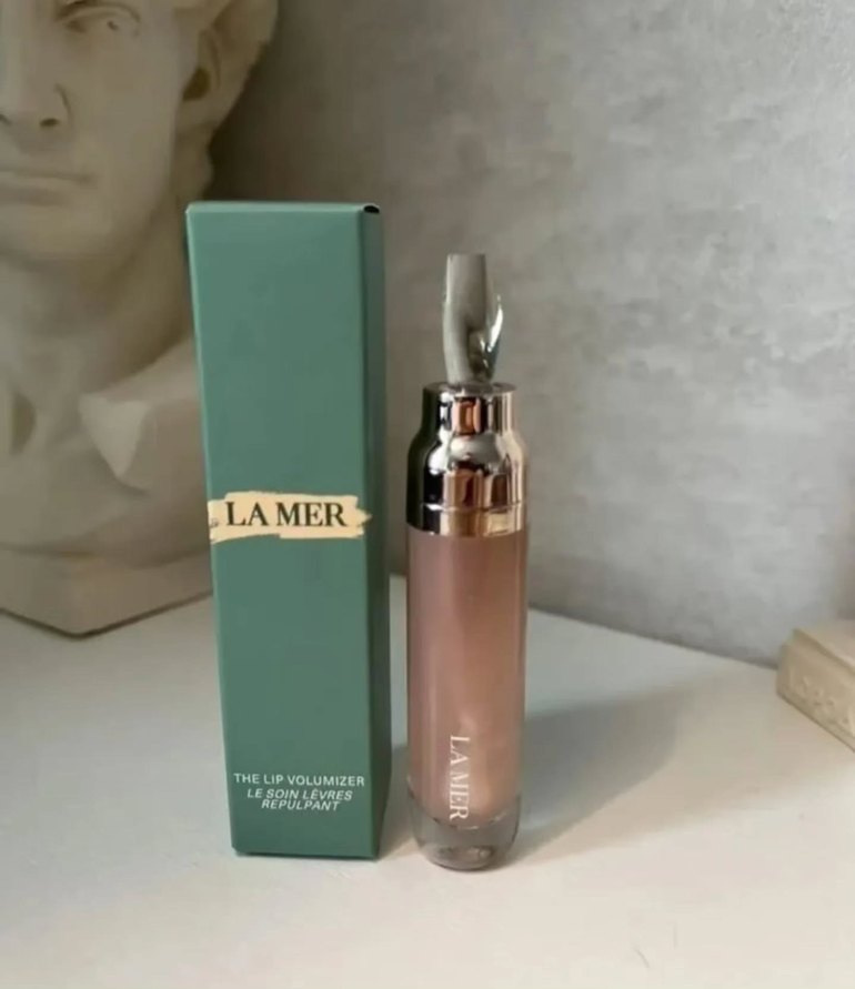 La Mer markasına ait açık bej renkte, parlak bitişli dudak parlatıcısı. Şık şişede ve orijinal kutusunda sunulmaktadır.