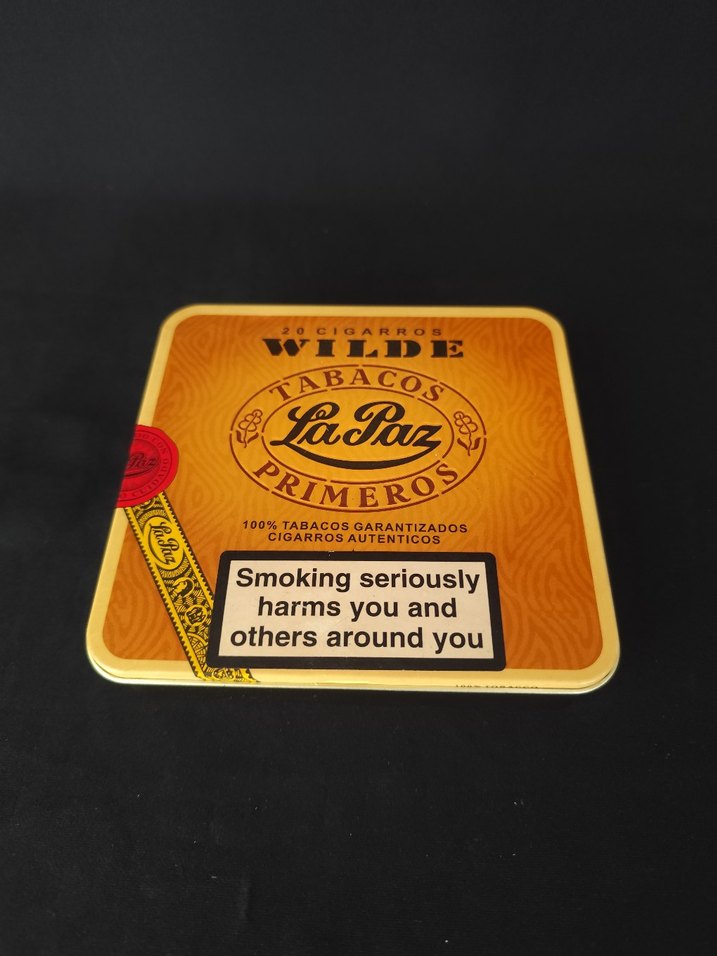 La Paz Wilde Puro metal kutu Parlak altın renkli vintage tütün tasarımı ve sigara uyarısı içerir. Pürüzsüz yüzeyiyle kolay kullanım sağlar. ️