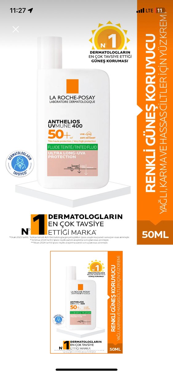 La Roche-Posay Anthelios 50+ renkli güneş koruyucu, ultra uzun UVA ve UVB koruması sağlar. Yağlı, karma ve hassas ciltler için uygundur. Dermatolog onaylı. ☀️ Eczaneden aldım 2 gün önce fakat renkli olduğu için beyaz tenkitim koyu geldi