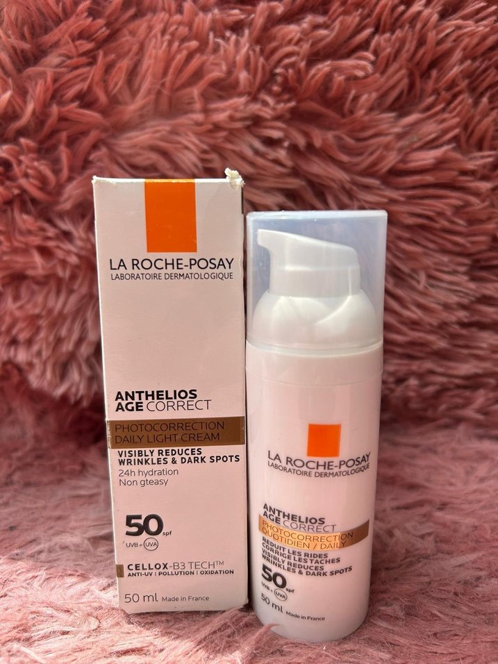 La Roche-Posay Anthelios Age Correct, SPF 50 koruma sağlar, kırışıklık ve koyu lekeleri azaltır. 24 saat nemlendirir, yağlı his bırakmaz. 50 ml, Cellox-B3 teknolojili krem. ☀️