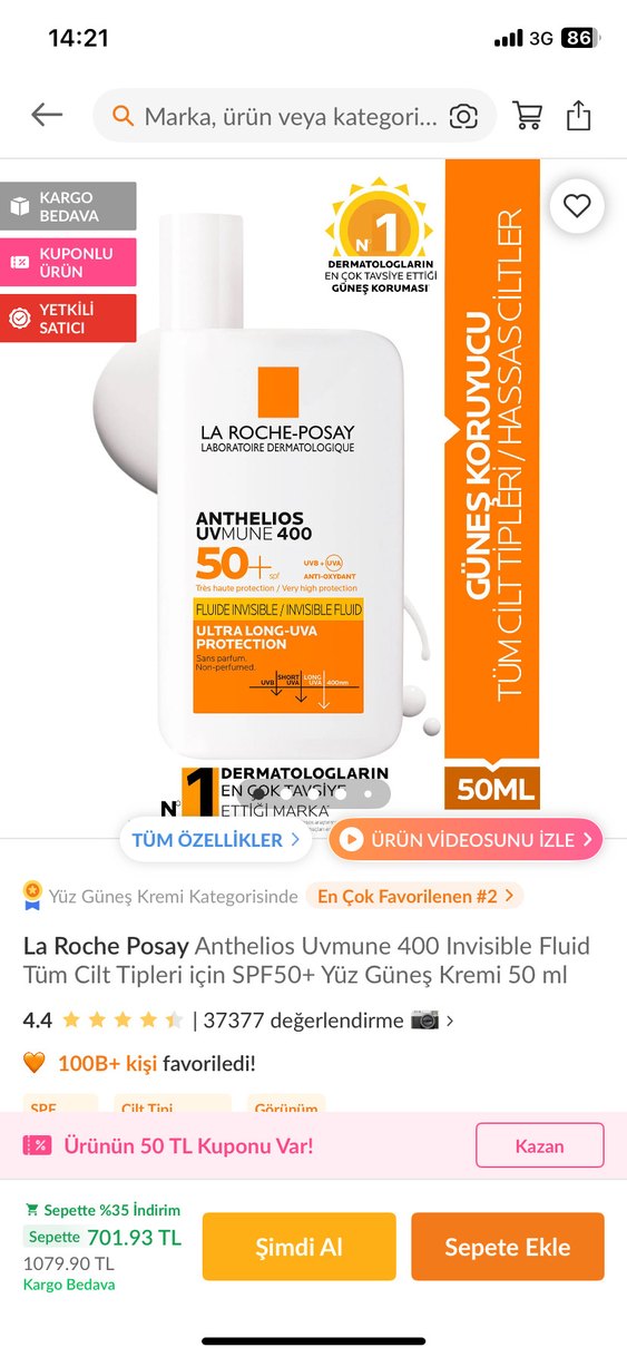 La Roche Posay Anthelios Uvmune 400 Invisible Fluid SPF50+ tüm cilt tipleri için ultra uzun UVA koruması sağlar. 50 ml yüz güneş kremi, akışkan ve görünmez yapıya sahiptir.KENDI SATICISINDAN ALDIM DERMATOLOGUM CILT TIPIME UYMADIGINI SOYLEDIGI ICIN SATIYORUM ACILMAMIS KUTU