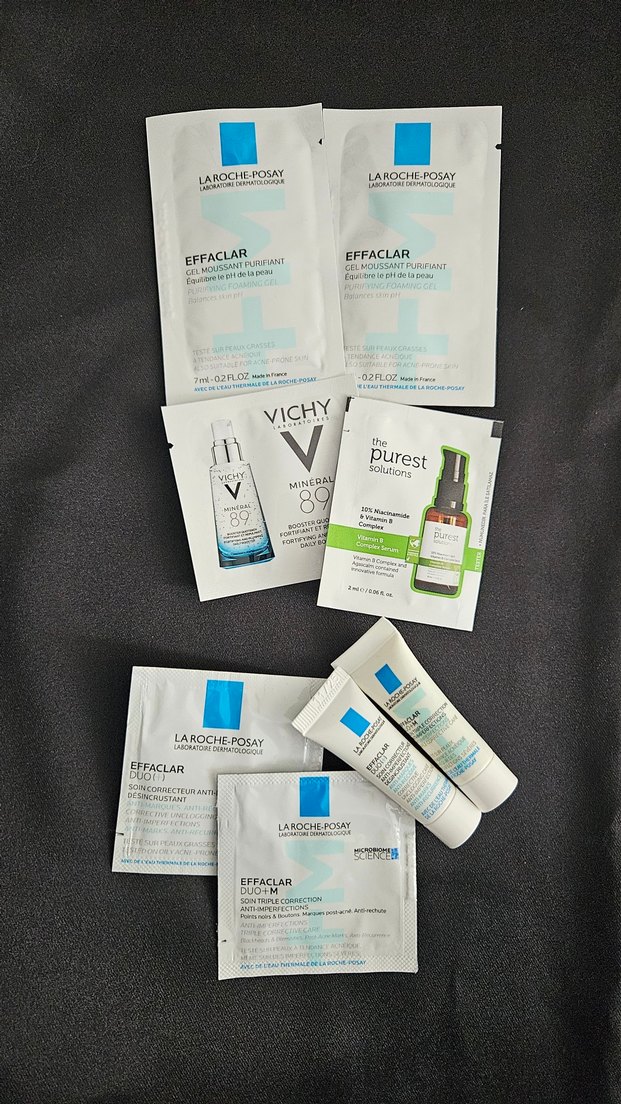 La Roche-Posay Effaclar duo M temizleyici jel 14ml, la roche posay effaclar duo+m nemlendirici krem 5ml, la roche posay effaclar duo+ nemlendirici krem 5 ml, Vichy Mineral 89 ve The Purest Solutions niasinamid, vitamin B komplex serumu içeren cilt bakım ürünleri deneme seti. Çeşitli tek kullanımlık ve küçük tüpler bulunur.