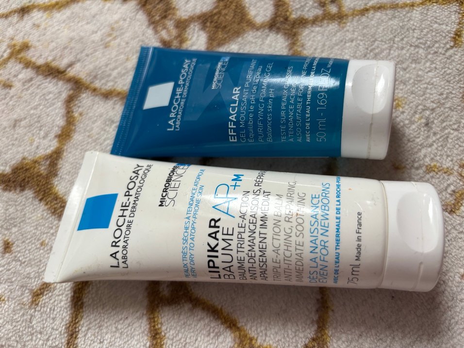 La Roche-Posay Effaclar yüz temizleme jeli ve Lipikar Baume AP+M kuru, hassas cildi anında yatıştırıp onaran bakım balsamı seti. Eczaneden almistm nemlendiricsni bikac kez jullandm sadece digerini hic kullanmadim