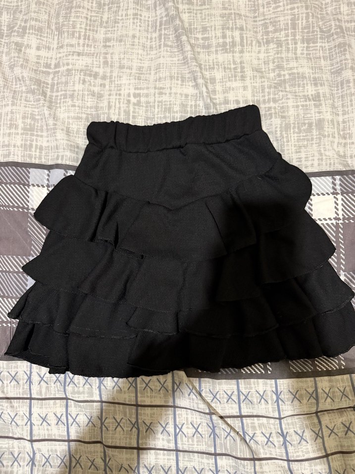 Koyu siyah renkte, sentetik kumaştan yapılmış, kat kat fırfırlı ve dar kesim mini etek. Sorunsuz xs s m uyar