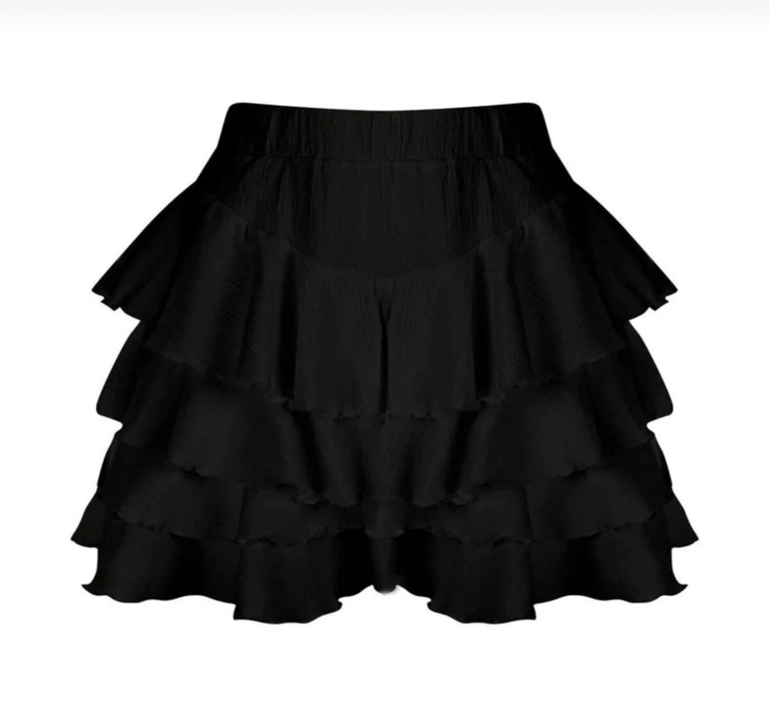 Siyah mini etek, bol kesim ve katmanlı fırfırlara sahip. Günlük kullanıma uygundur.