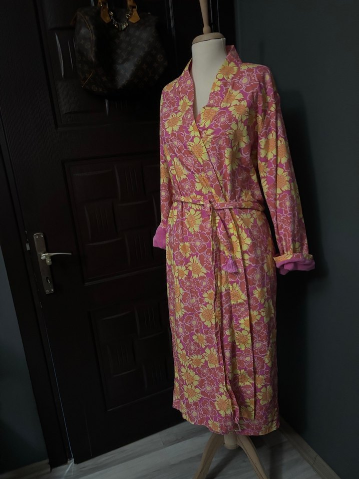 La senza kalitesi sayılı kullanıldı tertemiz kusursuz V yaka ve uzun kollu, bol kesim lohusa sabahlık. Pastel pembe tonlarında çiçek desenli, uzun boy rahat tasarım. Renkler şahane